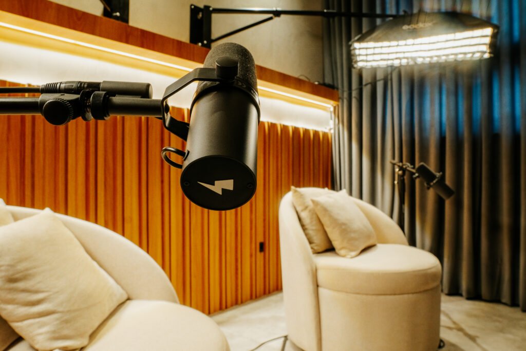 Estúdios próprios para produção audiovisual e gravação de podcast, sala de reuniões e espaços colaborativos que inspiram criatividade e troca de ideias.